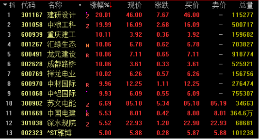 今日基建板块大幅走高,截止发稿,建研设计、重庆建工、龙元建设、成都路桥、中材国际、中铝国际涨停;中国电建、深水规院等个股涨幅超5%。