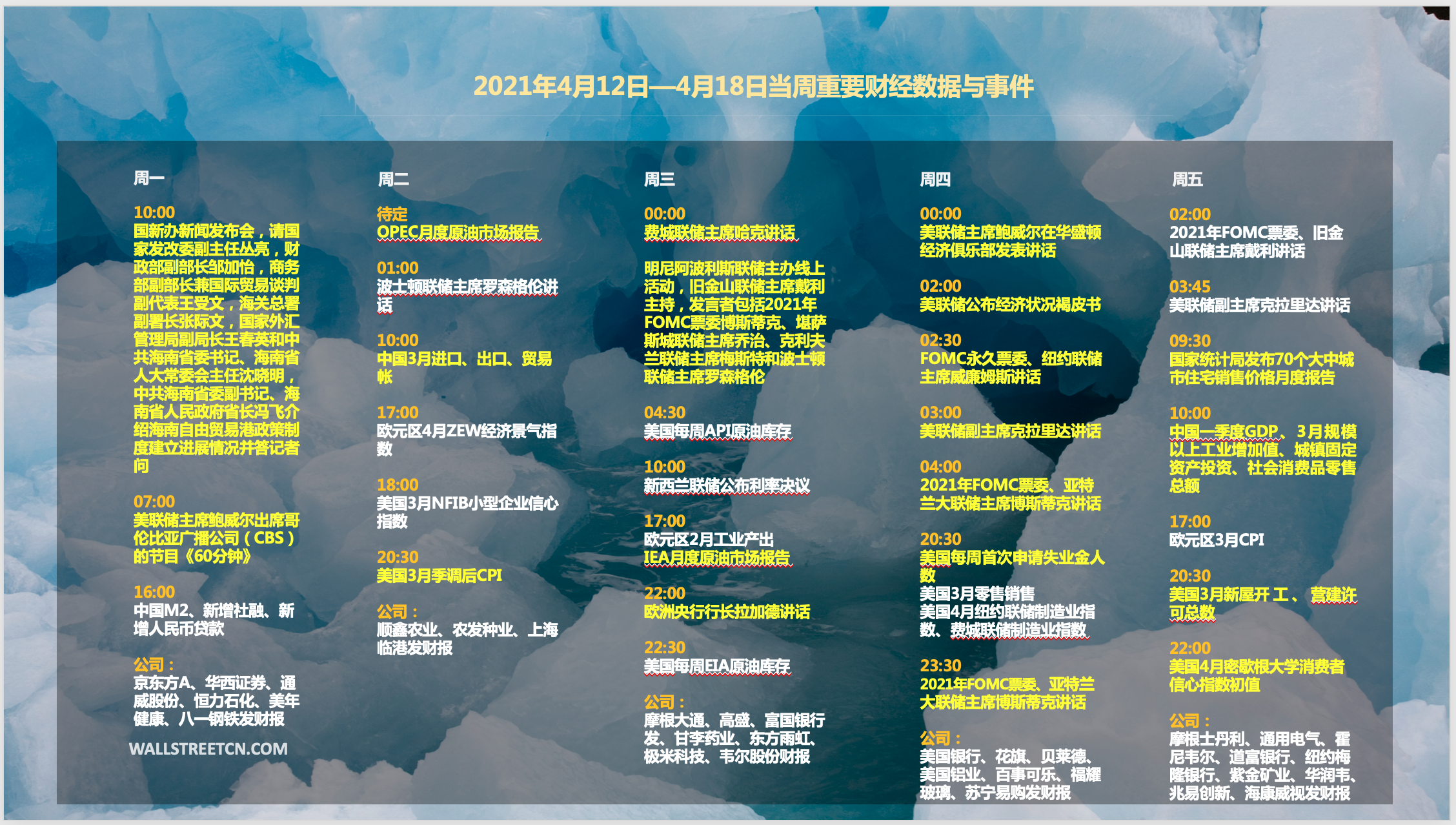 • 周三(4月14日),欧洲央行行长拉加德发表讲话,明尼阿波利斯联储主办题为“种族主义和经济:专注于经济学界”的线上活动,旧金山联储主席戴利主持,发言者包括2021年FOMC票委博斯蒂克、堪萨斯城联储主席乔治、克利夫兰联储主席梅斯特和波士顿联储主席罗森格伦;2021年FOMC票委、里奇蒙德联储主席巴尔金发表讲话;费城联储主席哈克在一场线上活动发表讲话;新西兰联储公布利率决议