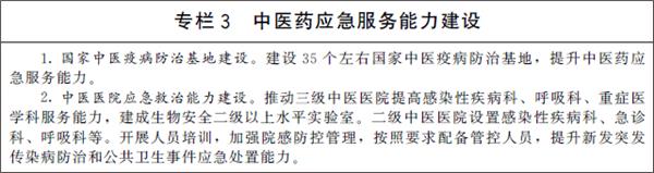 加强中医药应急救治能力建设。依托高水平三级甲等中医医院,建设覆盖所有省份的国家中医疫病防治基地,依托基地组建中医疫病防治队伍,提升中医紧急医学救援能力。三级公立中医医院和中西医结合医院(不含中医专科医院)全部设置发热门诊,加强感染性疾病、急诊、重症、呼吸、检验等相关科室建设,提升服务能力。