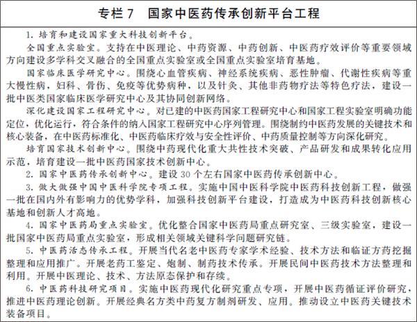 3.建设高层次科技平台。依托现有资源,建设一批国家级中医药研究平台,研究布局全国重点实验室、国家临床医学研究中心、国家工程研究中心和国家技术创新中心;推进国家中医药传承创新中心、国家中医临床研究基地和中国中医药循证医学中心建设。发挥中国中医科学院“国家队”作用,实施中医药科技创新工程。
