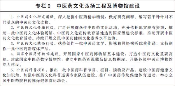 1.加强中医药文化研究和传播。深入挖掘中医药精华精髓,阐释中医药文化与中华优秀传统文化的内在联系。加强中医药学与相关领域协同创新研究。实施中医药文化传播行动,推动建设体验场馆,培育传播平台,丰富中医药文化产品和服务供给。推动中医药文化贯穿国民教育始终,进一步丰富中医药文化教育。加强中医药机构文化建设。加大对传统医药类非物质文化遗产代表性项目的保护传承力度。加强中医药科普专家队伍建设,推动中医医疗机构开展健康讲座等科普活动。建设中医药健康文化知识角。开展公民中医药健康文化素养水平监测。